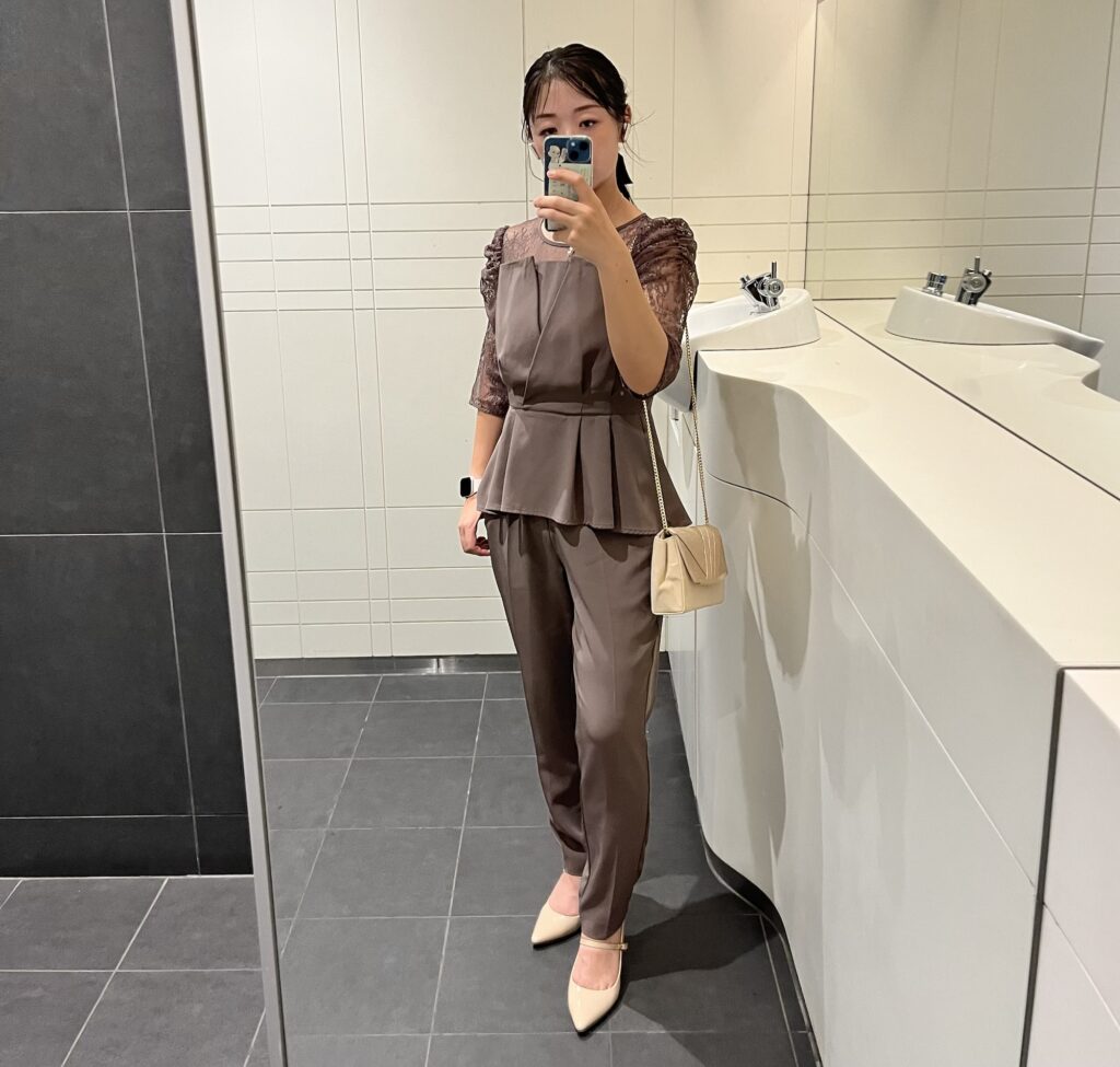 ホテルのラグジュアリーな雰囲気にも合い、秋らしさも感じられる落ち着いた色合い。動きやすく、食事のときも安心感があり、パンツスタイルに挑戦して大正解でした。